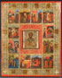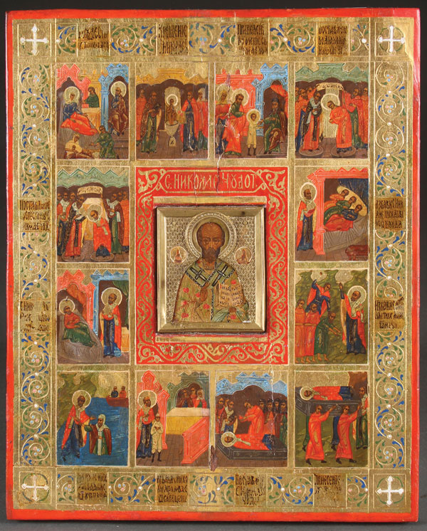A RUSSIAN ICON OF ST. NICHOLAS WITH LIFE SCENES, 20TH CENTURY. The center set with a metal covered icon of St. Nicholas and surrounded by scenes from his life. The borders finely decorated and inscribed with narratives describing the corresponding scenes. 11.5 inches x 9.3 inches (29.3 x 23.8 cm).