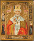 A RUSSIAN ICON OF ST. NICHOLAS, 19TH CENTURY. Colorfully painted on an intricately incised gilt ground, the borders with St. Tikhon, the Holy Martyr John, and the Holy Aphrina. 10.3 inches x 8.6 inches (26.5 x 22 cm).
