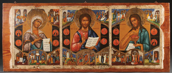 A LARGE RUSSIAN ICON OF THE DIESIS AND FEASTS DAYS, KHOLUI, 19TH CENTURY. Painted on a large single horizontal panel, at center Christ holds an open book of Gospels and delivers a blessing. He is flanked by the Mother of God (left) and John the Forerunner (right). The upper and lower borders painted with 15 Feast Day images and an image of the Mother of God Joy to All Who Sorrow. Additionally, on either side of each of the main figures are circular medallion shaped reserves painted with a different saint. The borders cleaned down to the gesso and with some losses. 22.75 inches x 54.75 inches (58 x 139 cm).