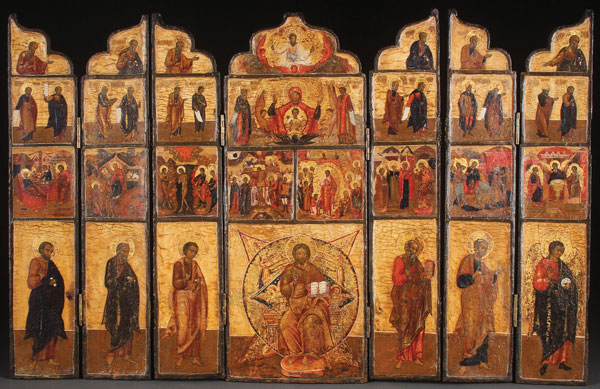 A RUSSIAN PARTIAL ASSEMBLED FOLDING ICONOSTASIS, 18TH CENTURY WITH LATER RESTORATIONS. The central panel with Christ Enthroned and above the crucifixion and resurrection, further still the Sign Mother of God below the Fatherhood image. Set with three hinged panels on both sides, each depicting various saints and Feast Days, exhibited in four tiers. 18.25 inches x 28.75 inches (46.5 x 73 cm).