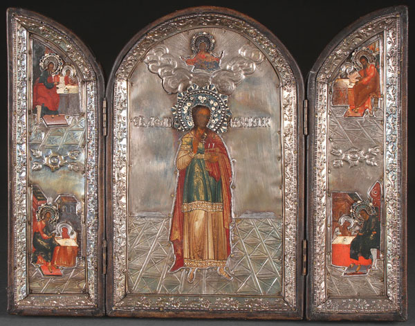 A RUSSIAN ICON TRIPTYCH, 19TH AND 20TH CENTURY. At top of the center arched panel Christ delivers a blessing and below a male saint holding a medicine box, but identified by the shoulder-height inscription as "ATHANASIUS OF ATHOS." The left and right wing with the Evangelists. Overlaid with 17th century style repoussé basma and with later attached haloes. 10.8 inches x 13.8 inches (27.5 x 35 cm) open.