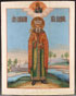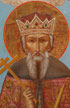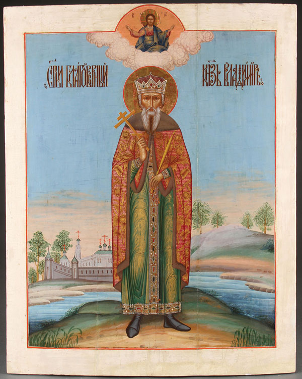 A LARGE AND IMPRESSIVE RUSSIAN ICON OF THE GREAT PRINCE VLADIMIR, PALEKH, CIRCA 1890. At top center within an arched reserve, Christ delivers a blessing above characteristically painted Palekh clouds. Below, stands a full length image of Vladimir who wears ornately embroidered and jewel encrusted royal robes and a crown. He holds a scepter in one hand and in the other a cross and in the background Kiev. The large inscribed Slavonic inscription identifies him as the "HOLY GOOD-BELIEVING PRINCE VLADIMIR." 35 inches x 28 inches (89 x 71 cm).