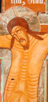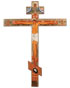 A LARGE AND IMPRESSIVE RUSSIAN PAINTED ICON CRUCIFIX, 19TH CENTURY. The top central section painted with the Holy Visage above two descending angels of the Lord. On the left, the sun that has darkened, and on the right, the moon that has become like blood. Below an interestingly painted image of the crucified Christ. The central cross beam terminating with the Mother of God (left) and the Apostle John (right). And below the feet of Christ the head of Adam and further still a cartouche inscribed with the standard prayer exalting the cross, "The Cross is Protector of All the World, The Cross is the Beauty of the Church, The Cross is the Might of Kings, The Cross is the Comfort of the Believers, The Cross is the Glory of Angels, The Cross is the Plague of Demons." 52.5 inches x 38.25 inches (134 x 97 cm).