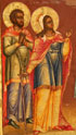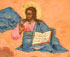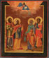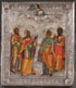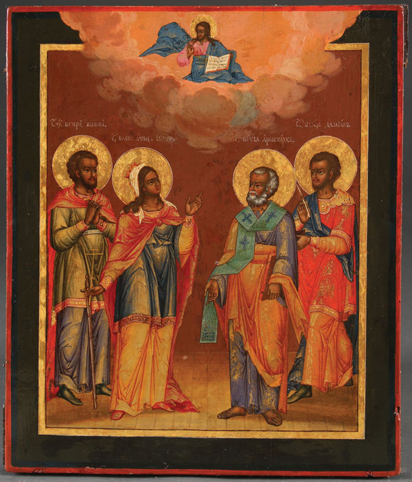 A FINE RUSSIAN ICON OF SELECTED SAINTS, ST. PETERSBURG, CIRCA 1875. At center on the upper margin Christ delivers a blessing and holds an open book of Gospels to Mathew 25:34. Below are four finely rendered full length images of Saints Cosmas, Catherine, the Holy Apostle Aristarchus, and Damien, each with garments finely highlighted in chrysography and overall finely painted being reminiscent of the St. Petersburg workshop of the Peshekhonov’s. Together with a silver repoussé riza hallmarked St. Petersburg, dated 1877, and Cyrillic maker’s mark “MI" (not illustrated). 12.25 inches x 10.5 inches (31.5 x 26.5 cm).