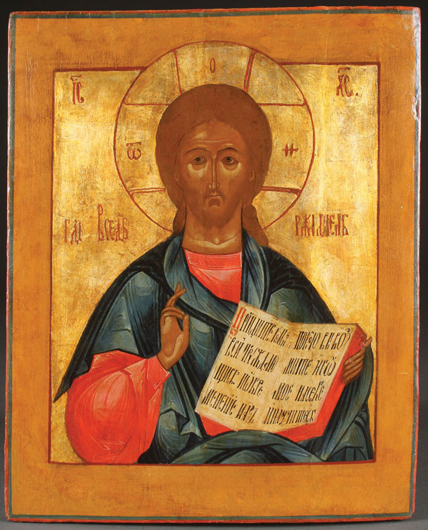 A RUSSIAN ICON OF CHRIST THE LORD ALMIGHTY, 19TH CENTURY. Here Christ delivers a blessing and holds an open book of Gospels to Matthew 11:28. 17 inches x 13.75 inches (43 x 34.5 cm). (Unillustrated)