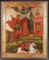A LARGE RUSSIAN ICON OF ST. DIMITRIY OF THESSALONICA, 19TH CENTURY. Here St. Dimitry is shown dressed as a warrior atop a large charging horse and striking down the King of the Infidels, seated on a fallen horse beneath him. In the background in a church, the Archangel Michael holds an icon of Dimitry, and at top center Christ delivers a blessing. The inscription above the upper margin identifies him as "The Holy Great Martyr Dimitry of Thessalonica Wonder-Worker." 17.5 inches x 14.5 inches (44.5 x 36.5 cm).