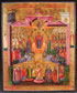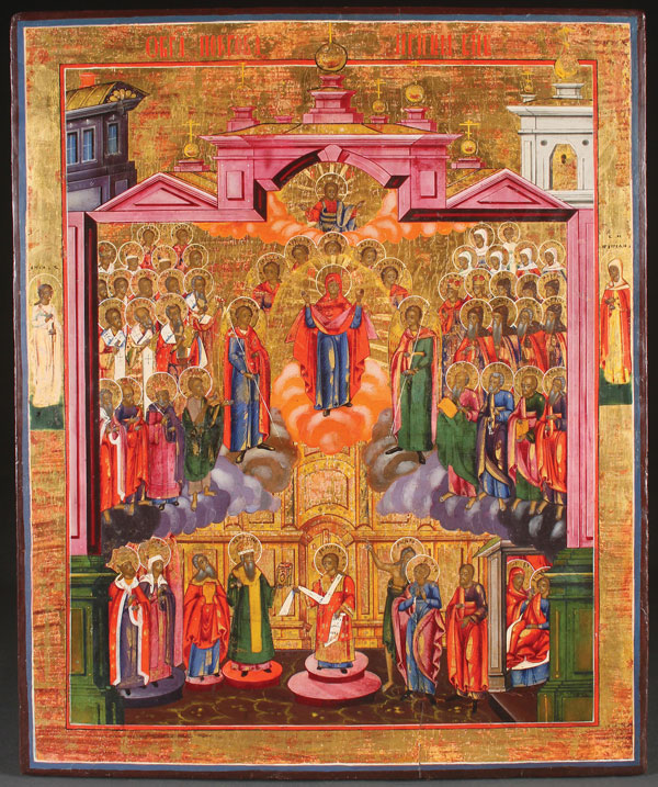 A LARGE RUSSIAN ICON OF THE POKROV MOTHER OF GOD, PROBABLY NEVYANSK, CIRCA 1800. Colorfully painted on a gilt ground and with the names of each figure inscribed within their haloes. The border with the Guardian Angel and St. Tatiana. In original, undisturbed condition. 20.8 inches x 17.4 inches (53 x 44 cm).
