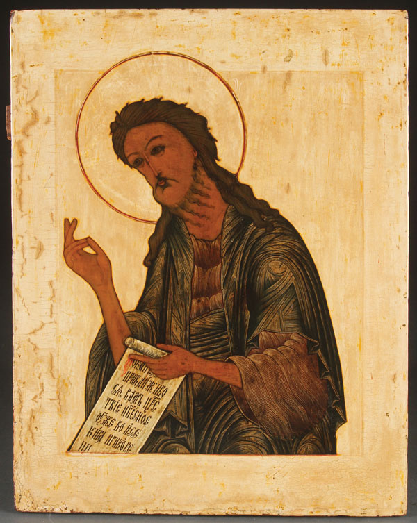 AN OLD BELIEVERS RUSSIAN ICON OF ST. JOHN THE FORERUNNER, 18TH CENTURY. Finely painted, here John delivers a blessing in the manner favored by the Old Believers and holds a scroll which begins, "Repent ye: for the kingdom of heaven is at hand…" (Matthew 3:2). 21 inches x 16.5 inches (53 x 42 cm).