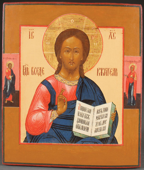 A RUSSIAN ICON OF CHRIST, CIRCA 1800. Finely painted Christ holds an open book of Gospels to Matthew 11:28 and delivers a blessing. The left border painted with the Holy Apostle and Evangelist Luke and the right border with the Holy Venerable Elizabeth. 14.1 inches x 12 inches (36 x 30.5 cm).
