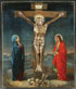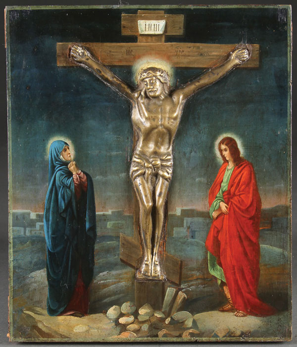 A UNIQUE AND INTERESTING RUSSIAN ICON OF THE CRUCIFIXION, 19TH CENTURY. Realistically painted in oil, the Mother of God (left) and the Apostle John (right) flank an eight-sided Orthodox cross with inset cast bronze corpus. Such icons were often created as receptacles for sacred objects passed down through the family. 12.25 inches x 10.3 inches (31 x 26.5 cm).