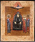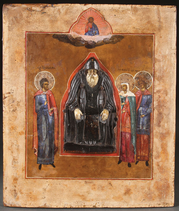 AN INTERESTING RUSSIAN ICON OF ST. NIL STOLBENSKIY WITH SAINTS, 19TH CENTURY. At top center, Christ delivers a blessing and below at center, an inset carved figure of St. Nil flanked by the family saints Trophimous, Alexandra, and Catherine. Probably created after a pilgrimage to St. Nil's monastery, a popular site to visit by pious Russians. 12.25 inches x 10.5 inches (31 x 26.5 cm).