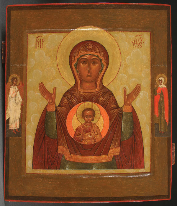 A RUSSIAN ICON OF THE SIGN MOTHER OF GOD, 19TH CENTURY IN THE 17TH CENTURY STYLE. Finely painted with gold-shaded haloes, the left border with the Guardian Angel, and on the right border a monastic female saint. 14 inches x 12 inches (35.5 x 30 cm).