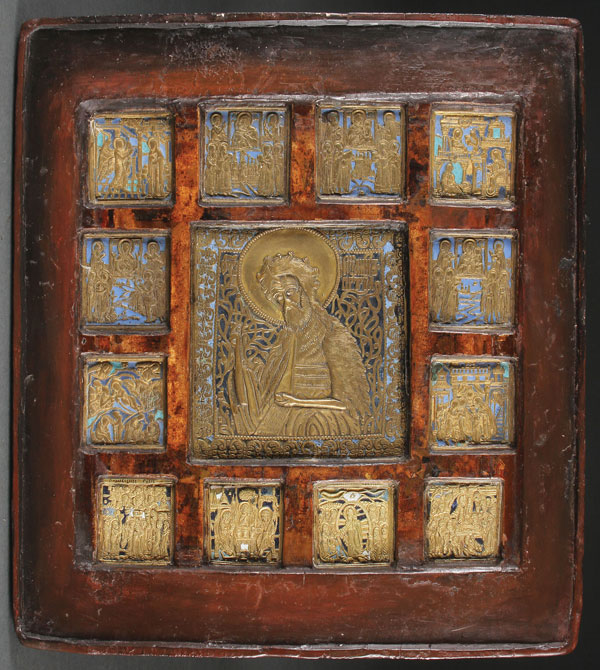 A RUSSIAN ICON OF ST. JOHN THE BAPTIST WITH FEASTS, 18TH AND 19TH CENTURY. At the center of the 17th century wood panel, a cast brass and enameled icon of John the Forerunner is inset and surrounded by 12 smaller cast brass and enameled icons depicting Feast Days or as related to Mother of God images. 12.5 inches x 11 inches (31.6 x 28 cm).