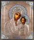 A RUSSIAN ICON OF THE KAZAN MOTHER OF GOD, MOSCOW, 1896. Realistically rendered and overlaid with a machine-engraved silver riza with later added cloisonné haloes, corners, and title plaques. The riza hallmarked Moscow, dated 1896, and with Cyrillic maker's mark "N.I.K.," and 84 silver standard. 10.6 inches x 9 inches (27 x 22.5 cm).