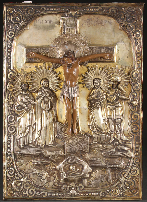 AN INTERESTING RUSSIAN ICON OF THE CRUCIFIXION, 19TH CENTURY. Comprising an ornate and finely crafted silver plated repoussé metal riza with attached carved and polychrome wood corpus. 15.75 inches x 11 inches (40 x 28 cm).