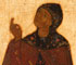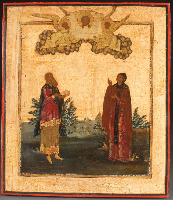 AN INTERESTING PRESENTATION RUSSIAN ICON, SIGNED AND DATED 1790. At top center two finely painted angels hold aloft the Holy Napkin and below in a landscape a princely saint (at left) and a monastic female saint at right. The verso originally gessoed and painted overall in red and with ornate gilt border and at the center still remaining is an ornate gilt cartouche with inscribed Slavonic panel mostly intact, "In the year 1790, 4th day of March. This holy image was painted for the orphanage in the city of Rybnoye....at the request of the peasant Guriy Vasiliev, painted in Moscow by the icon painter Ivan Kuritsyn.” The borders and background of the front of the icon cleaned down to the gesso. 16 inches x 13.75 inches (40.5 x 35 cm).