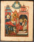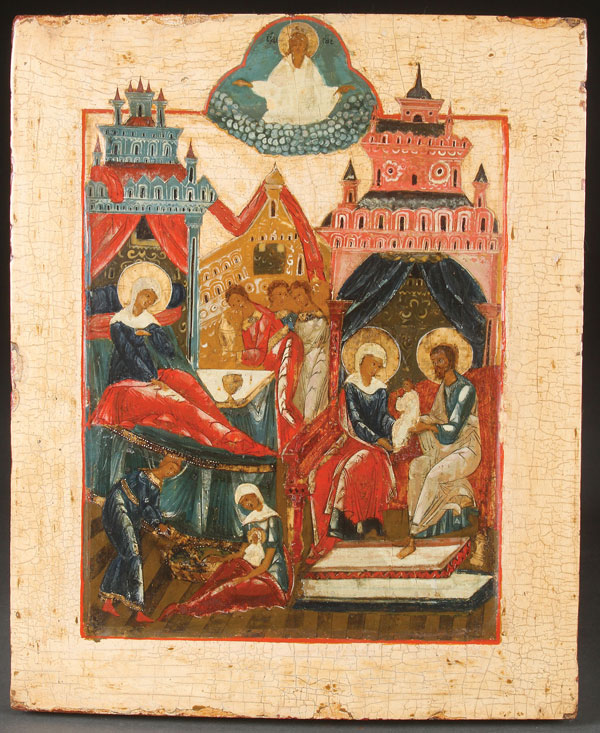 A RUSSIAN ICON OF THE BIRTH OF THE MOTHER OF GOD, PROBABLY 17TH CENTURY WITH LATER RESTORATIONS. The verso with old dedicatory inscription and old Soviet collection inventory number. 12.6 inches x 10.25 inches (32 x 26 cm).