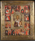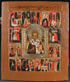 A RUSSIAN ICON OF ST. NICHOLAS WITH LIFE SCENES, 19TH CENTURY. At center traditional depiction of St. Nicholas as bishop surrounded by 12 scenes from his life, overlaid with a brass riza. 14.25 inches x 12.25 inches (36 x 31 cm).