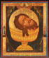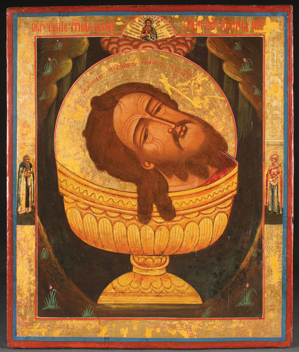 A LARGE RUSSIAN ICON OF THE FINDING OF THE HEAD OF JOHN THE FORERUNNER, 19TH CENTURY. At top center Christ delivers a blessing and below the head of John is shown on a footed dish within a hole in the ground. There are three separate incidences in which his head is discovered. Within his halo is inscribed the words, “The Holy Great Prophet John the Forerunner." On the side borders two saints and the upper margin inscribed with the title of this icon, "THE FINDING OF THE HONORABLE HEAD OF THE HOLY PROPHET JOHN THE FORERUNNER." 21.25 inches x 18 inches (54 x 46 cm).