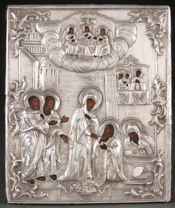 A RUSSIAN ICON OF THE APPEARANCE OF THE MOTHER OF GOD TO ST. SERGIY OF RADONEZH, 19TH CENTURY WITH LATER RESTORATIONS. Overlaid with a presumably silver repoussé and chased riza with indistinguishable marks. 12.25 inches x 10.25 inches (31 x 26 cm).