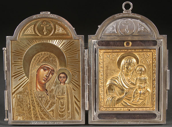 AN INTERESTING RUSSIAN FAMILY MEMORIAL ICON DIPTYCH, ST. PETERSBURG 1863. The matching hinged arched topped wings each containing an icon of the Mother of God. On the left the Kazanskaya with machine-engraved gilt riza and later painted icon and on the right a gilt metal relief icon pendant of the Hodigitria Mother of God. The second framed under glass against a lock of hair. The lower margins engraved in Cyrillic, “Your mothers icons and hair” and on the upper margin, also engraved in Cyrillic, “16 July 1863 Baden-Baden” presumably the day, year, and location of death. The hinged panels hallmarked St. Petersburg, dated 1863, and possibly Latin makers mark of “CS,” and 84 silver standard. The verso of each panel backed in a ribbed exotic wood with silver studs around the border and the top of each panel with folding suspension loop. 4.75 x 6.75 inches (12 x 17 cm) open.