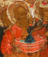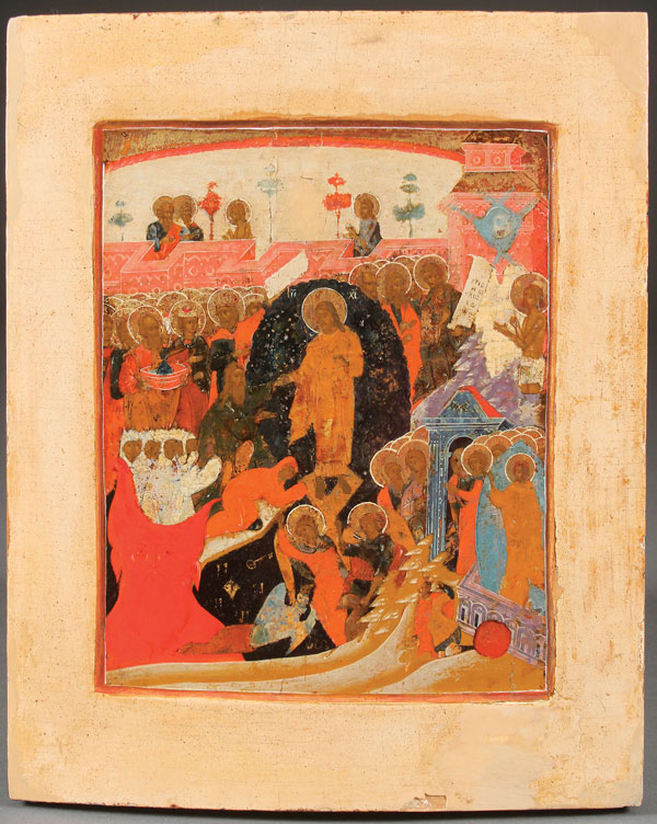 A RUSSIAN ICON OF THE DESCENT INTO HADES, PALEKH, CIRCA 1800. At center the resurrected Christ atop the broken gates of hell. He reaches down to grasp the hand of Adam while Eve prostrates herself at His feet. Below, angels bind Hades. On either side of Christ the righteous men and women of the Old Testament are seen being released from bondage including Noah (who holds a model ark), Kind David, and on the right John the Baptist. Further right the “Good Thief” enters the gates of paradise with the scene continuing at top with him being greeted by Abraham and Isaak. 13.5 inches x 11 inches (34 x 28 cm).