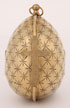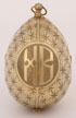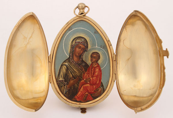 A LARGE IMPERIAL RUSSIAN PERIOD SILVER GILT AND ENGRAVED EASTER EGG, 5TH ARTEL, MOSCOW 1908-1917. The body overall engraved with a repeating star pattern and the front set with a cross and opening to reveal brightly gilded wings and at center a painted icon of the Tikhvin Mother of God, probably later, executed in an oval reserve. The finial with integral suspension loop and at the base a folding locking latch device. The verso engraved with the abbreviated Slavonic Easter greeting "XB." Hallmarked Moscow, 1908-1917, maker's mark of the 5th Artel 5A, and 84 silver standard. Height 5 inches (12.7 cm).