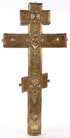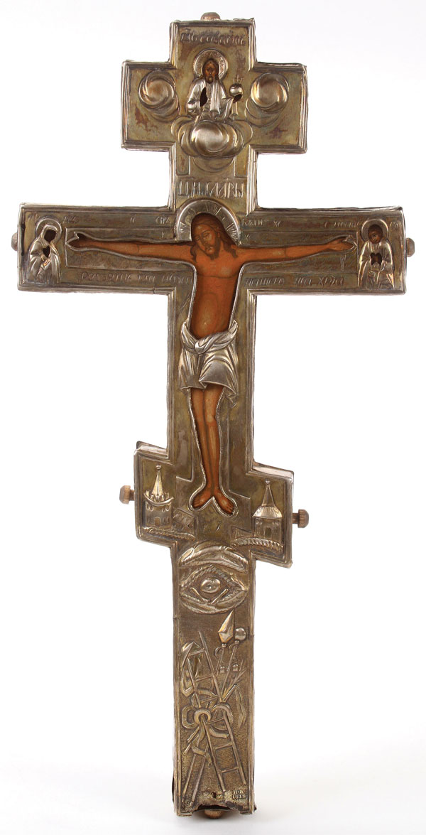 A RUSSIAN ICON BLESSING CRUCIFIX, KALUGA, 1812. The wooden eight-sided cross painted with the crucified Christ beneath God the Father and the cross beam ends terminating with images of the Mother of God (left) and the Apostle John (right). Beneath the feet of Christ are displayed implements of the Passion and the skull of Adam. Encased in a two-piece gilded silver repoussé and chased riza, the verso heavily repoussed with flower forms. Hallmarked Kaluga, dated 1812, and with 84 silver standard. Height 15 inches (38 cm). Width 7 inches (18 cm).