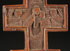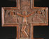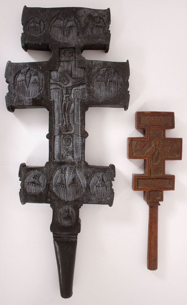 A PAIR OF CARPATHO-UKRAINE “HUSTUL” CARVED WOODEN BLESSING CROSSES, CIRCA 1875-1900. The first being a thick wooden cross carved on both sides from a single piece of wood. The front carved with the crucified Christ surrounded with medallions carved with other unidentified figures. At the center of the verso is a low relief figure carved figure of the Mother of God with the infant Christ above a figure of an Imperial Saint wearing crown and similar to the front, surrounded by medallions with other unidentified figures. 17 inches x 7 inches (43 x 18 cm). Together with a smaller, more finely carved signed and dated cross. The front carved with the crucified Christ above the date 1874. The verso carved with the Virgin and child flanked by cherubs and above a reserve carved in Slavonic with the name “Evano Stamor.” 9.5 inches x 3.25 inches (24 x 8 cm).