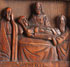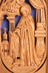 A PAIR OF CARVED WOOD RUSSIAN MONASTERY ICONS, 18TH AND 19TH CENTURY. The first in three rows, at top center St. Barbara flanked by two monastic saints, in the middle a figure of the Dormition, the lower with St. John the Much Suffering. Contained in a later metal frame. The icon 5.5 inches x 3.25 inches (14 x 8.5 cm). The second being a carved figure of the Venerable St. Sergiy of Radonezh. 5.25 inches x 3.1 inches (13.5 x 8 cm). Together with a carved bone icon of St. George, 17th or 18th century. Macedonia? 4.75 inches x 2.6 inches (12 x 6.5 cm).