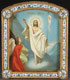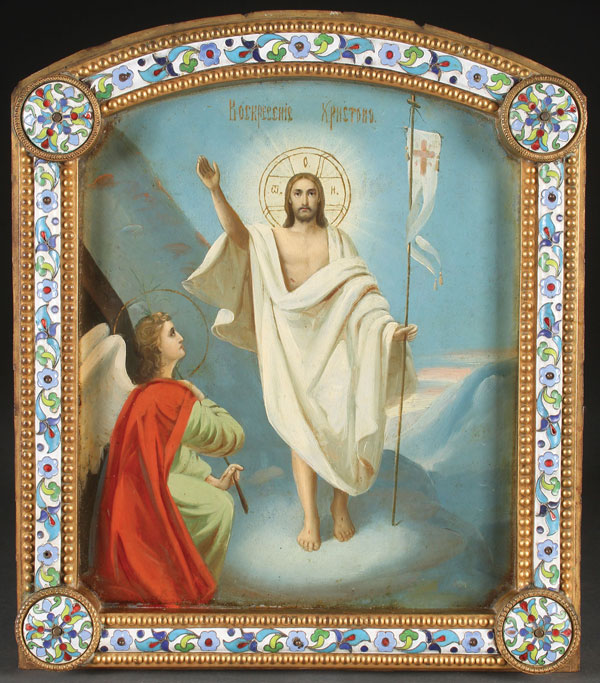 A RUSSIAN DOUBLE-SIDED PROCESSIONAL ICON, 19TH CENTURY. Each side realistically painted with a different image, including St. Nicholas and the Resurrection Christ. Contained in an ornate gilt-brass and cloisonné enamel arched top frame. 15.5 inches x 13.5 inches (39.5 x 35 cm).