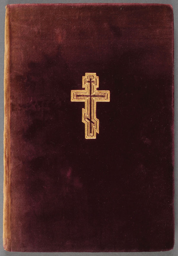 AN IMPERIAL RUSSIAN PRAYER BOOK BELONGING TO TSAREVICH ALEXI NIKOLAEVICH, CIRCA 1910. Comprising an Akathist book on the Three Hierarchs published in St. Petersburg in 1910 as presented to the Tsarevich with purple velvet covers and embossed gilt cross on front. The interior with lengthy dedicatory inscription, “To His Imperial Highness the Heir Tsarevich Grand Duke Alexei Nikolaevich, Chief Commander [Ataman] of the Don and All Cossack Armies, From the loyal subject [and] publisher of these books, Konstantin Semernikov, Abbot of the Cell of Holy John Chrysostom on the Holy Mount of Athos at the Iviron Monastery.” Additionally the inside front cover with old hand-written Soviet inventory collection label inscribed in Russian "Alexandro[ovsky] palace quar[ters] [of] the heir's classroom. No. 747." 9.75 inches x 6.75 inches (25 x 17 cm).