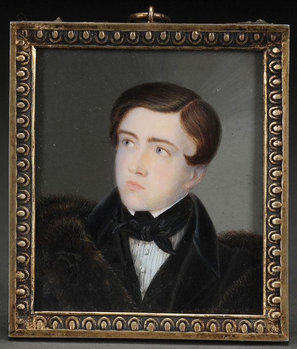 A VERY FINE RUSSIAN PORTRAIT MINIATURE, DATED 1822. Depicting a young man with fur-collared coat, signed with interlocking monogram "KO" and dated 1822. Contained in a silver-gilt frame with egg dart border and suspension loop. Hallmarked St. Petersburg, 1908-1917, 84 silver standard, and indistinguishably Cyrillic maker's mark. 2.9 inches x 2.6 inches (7.5 x 6.5 cm).