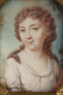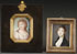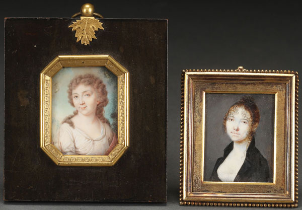 A PAIR OF MINIATURE PORTRAITS, PROBABLY RUSSIAN, CIRCA 1790-1825. The first depicting a middle-age woman with curly hair with landscape background. Signed on the edge “AUGUSTEU” and dated 1791. Contained in an ebony frame with octagonal gilt-lined aperture and gilt leaf suspension loop at top. Verso also inscribed in pencil, “St. Petersburg” in Latin. Overall including frame 3.75 inches x 3.25 inches (9.5 x 8.5 cm). Together with another miniature portrait of a young woman with high black-collared dress and cascading locks. Verso inscribed in Cyrillic, “Moscow.” Contained in a presumably gilt-silver (unmarked) stepped frame with beaded edge and suspension loop. Overall including frame 2.75 inches x 2.25 inches (7 x 6 cm).