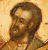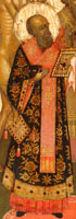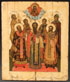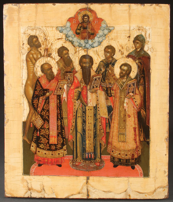 A RUSSIAN ICON OF SELECTED SAINTS, KOSTROMA, 18TH CENTURY. At top center within a triple arched reserve, Christ delivers a blessing from the heavens depicted as uniquely modeled clouds, and below a gathering of seven finely painted saints. The front row likely depicting the Three Hierarchs. 12.5 inches x 10.6 inches (32 x 27 cm).