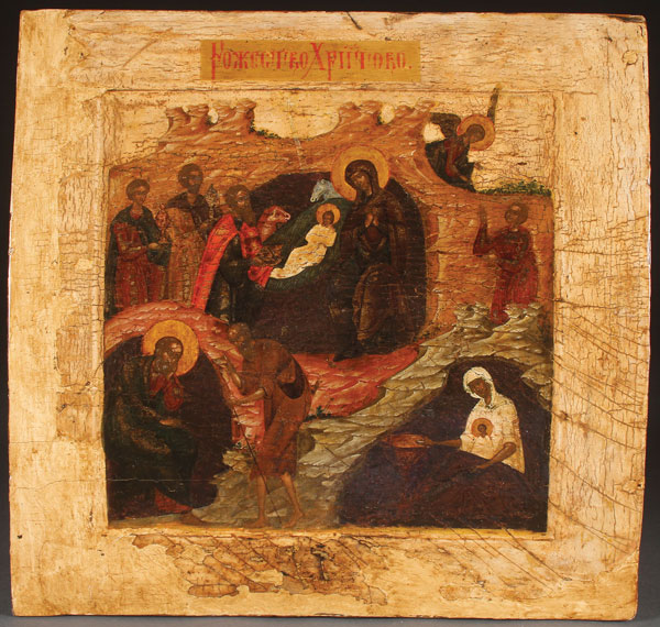 A RUSSIAN ICON OF THE NATIVITY OF CHRIST, 18TH CENTURY. At center the Mother of God with the newborn infant Christ. At left the three Magi approach with gifts and on the right an angel of the Lord announces the good news to a shepherd. Lower right a midwife prepares to bathe the newborn Christ and at lower left the Devil, disguised as an old shepherd, tries to create doubt in the mind of Joseph as to the virginity of Mary. 17.1 inches x 17.75 inches (43.5 x 45 cm).