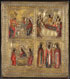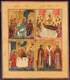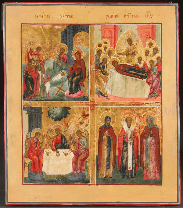 A RUSSIAN ICON IN FOUR PARTS, KOSTROMA, CIRCA 1800. The panel divided into four equal quadrants and each depicting a separate iconographic scene. Clockwise from upper left they are: the Nativity of Christ, the Dormition of the Mother of God, St. Nicholas with Saints Feodosiy and Evdokia, and the Old Testament Trinity. Overlaid with a very heavy repoussé brass riza. The riza not illustrated. 14.25 inches x 12.3 inches (35.5 x 31 cm).