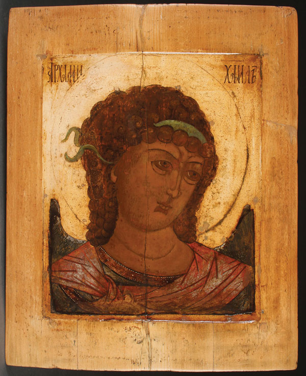 A RUSSIAN ICON OF THE ARCHANGEL MICHAEL, PROBABLY 19TH CENTURY. Here depicted in bust portrait form and following the canons of the 17th century, and executed on a 17th century panel. 14 inches x 11.5 inches (35.3 x 28.5 cm).