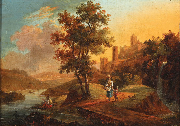 Travelers on a Road with Man Fishing and A Mother and Child in Farmyard-a pair