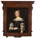 A RENAISANNCE OR RENAISANNCE STYLE PAINTING OF A WOMAN HOLDING A GOLD WATCH, PROBABLY ITALIAN. Depicting a well-attired woman with lace dress, pearl necklace and earrings, and holding in her hand a gold pocket watch with silk ribbons. Contained in a carved and gilt wood tabernacle style frame with overhanging canopy. The painting 31 inches x 26.4 inches (79 x 67 cm). Overall including frame 43 inches x 39 inches (109 x 99 cm).