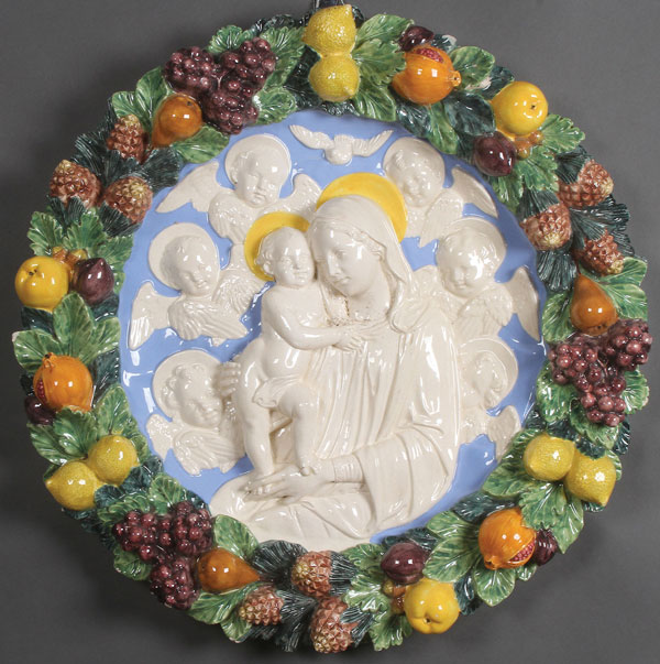 A LARGE DELLA ROBBIA STYLE GLAZED TERRACOTTA TONDO, ITALIAN. Depicting the Madonna and Child surrounded by winged cherubs with the Holy Spirit above them, on a blue field within a raised border of various fruits including pomegranates, pears, grapes, pine cones and others. Verso with retailer's label of G. Pasquinucci, Firenze. Diameter 27 inches (68.5 cm).