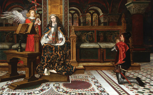 The night came that she should go to bed with her husband and when they were both in their chamber alone, she said to him in this manner: “O, my best beloved and sweet husband, I have a counsel to tell thee, if so be that you will keep it secret and swear that ye shall betray it to no man.” Valerian said that he would gladly promise and swear never to betray it, and then she said to him: “I have an angel that loves me, which forever watched over my body whether I sleep or wake, and if he may find that ye touch my body by villainy, or foul and polluted love, certainly he shall slay you, and so should ye lose the flower of your youth. And if so be that you love me in holy love and cleanness, he shall love thee as he loves me and shall show to thee his grace.” Then Valerian, corrected by the will of God, having dread, said to her: “If you wish that I believe that you say to me, show to me that angel that you speak of, and if I find veritable that he be the angel of God, I shall do what you say.” Cecilia answered to him: “If you will believe and become baptized you, too, shall see the angel.