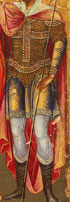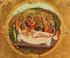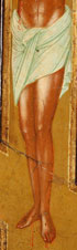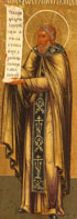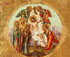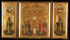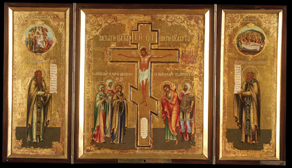 A LARGE AND IMPRESSIVE TSAR ALEXANDER III IMPERIAL PRESENTATION RUSSIAN ICON TRIPTYCH OF THE CRUCIFIXION, TRINITY SERGIEV LEVRA WORKSHOP, CIRCA 1890. At center on a gilt panel with decoratively incised borders, a finely painted inset wood crucifix. Lower left the three Mary's and at lower right the Apostle John and the Roman centurion Longinus with each figure identified by the inscription above their head. The top of the left wing with a finely painted image of the Removal from the Cross within a circular medallion cartouche within incised border, and below a full length image of a monastic saint identified by the inscription above his head as "HOLY JOHN OF THE LADDER." The right wing with a similarly painted image within a circular medallion depicting the Placement into the Tomb, and below a monastic saint identified by the inscription above his head as "HOLY JOSEPH THE HYMNOGRAPHER." Verso of central panel with a dedicatory inscription, "THIS ICON WAS PAINTED IN COMMEMORATION OF THE SOVEREIGN IMPERIAL ALEXANDER III TO THE TRINITY SERGIEV LEVRA." Contained in a custom-made polished rosewood hinged triptych frame with flush mounted spring release. 11.5 inches x 20 inches (29 x 51 cm) open.
