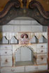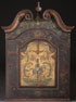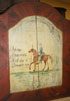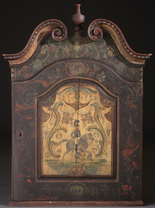 A VERY FINE NORWEGIAN SECRETARY CABINET WITH ROSEMALING, CIRCA 1850, IN THE TELEMARK STYLE. The large exterior paneled door with arched top and inscribed "A.A.F. 1850" below a raised carved panel scene of a military equestrian figure on a cream ground, the case surmounted by a carved double scroll broken pediment with dentil band and turned finial. The door opening to reveal on verso an additional horse mounted military figure and inscribed "Johanes Annonsen Fodt den 18 Desember 1848" within a grain painted surround, the interior with fitted drawers and compartments including a secret latching hidden compartment. Later suspension mounts for hanging. Height 45.5 inches (115.5 cm), width 29.5 inches (75 cm), and depth 10.75 inches (27 cm).