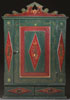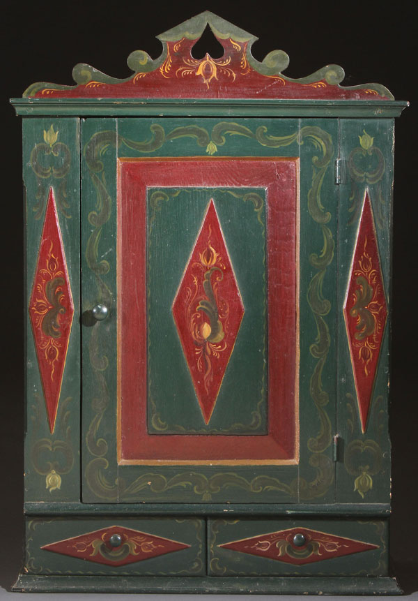 A 19TH CENTURY NORWEGIAN CARVED AND POLYCHROME WOOD WALL CABINET. The single door above two drawers, decorated with a raised diamond form with floral rosemaling in red reserved on a forest green ground, and surmounted with a scalloped carved pediment. The height 37 inches (94 cm), width 23.5 inches (59.5), depth 9.75 inches (24.5).