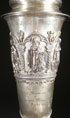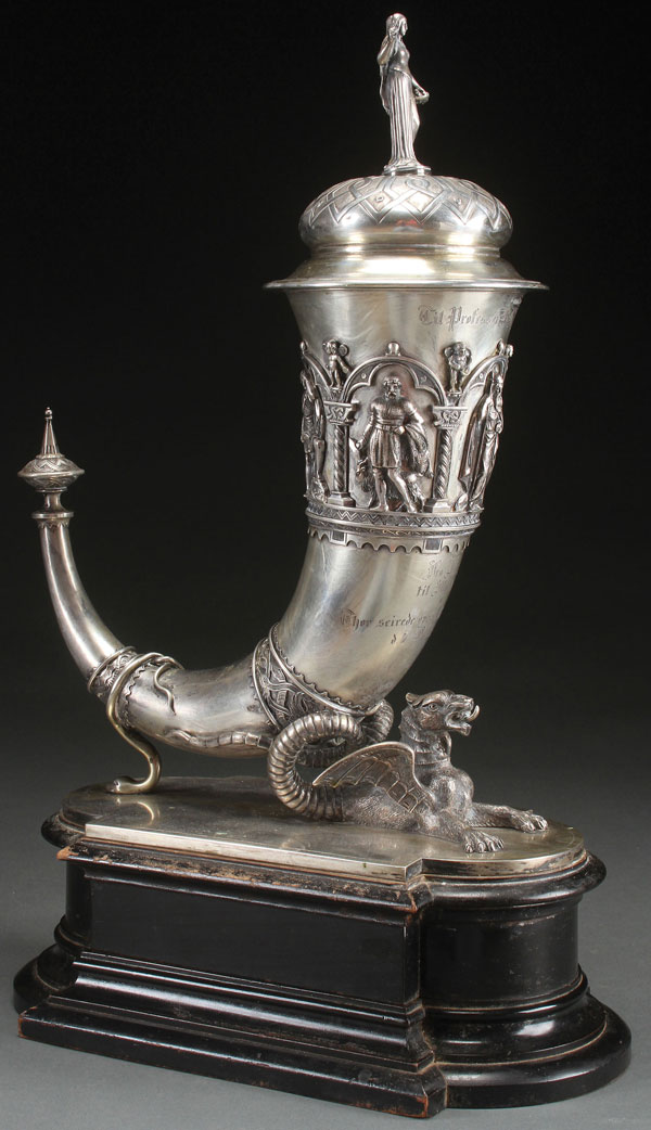 AN IMPRESSIVE 19TH CENTURY DANISH SILVER PRESENTATION DRINKING HORN, CHR. RASMUSSEN 1886, KJØBENHAVN. As presented to Professor Rasmus B. Anderson, the curved cow horn form with sculpted frieze of Norse figures within gothic arched porticos and surmounted by a domed cover with a figural finial of Freye, the Norse Goddess of Harvest, and resting on a winged Griffin support above a lobed end rectangular base plate and further raised on a conforming ebonized wood plinth with presentation inscription [to] “Professor R. B. Anderson [from] M.B at Thor seirede over Midgaardsormen 17 Decbr 1888”. Stamped Marks for Chr. Rasmussen, .925, three tower date mark, and Simon Groth (1863-1904) assay master mark. Net weight of silver 48.68 troy oz. Height 17.5 inches (44.5 cm).