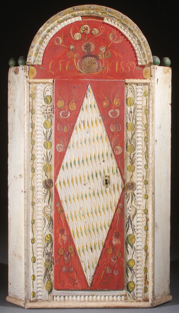 A VERY FINE NORWEGIAN CORNER WALL CABINET WITH ROSEMALING IN THE OS STYLE, DATED 1859. The single panel door carved with a raised diamond form and further carved with vertical and angular flutes, reserved on a red painted ground with stylized blossoms, and within a black and lime floral painted border accented with a carved half-cylindrical molding on cream colored ground, below a similarly decorated arched cornice inscribed "L.F.S.K. 1859." The height 48.5 inches (123 cm), the width 27 inches (69 cm), the depth 17.5 inches (44.5 cm).