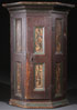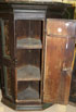 A FINE EARLY 19TH CENTURY NORWEGIAN WOOD CORNER WALL CUPBOARD WITH ROSEMALING, DATED 1817. The front with three sides, each with deep inset rectangular panels decorated with scrolled leaves and florals on a cream ground with the center panel door opening to two interior shelves. Inscribed and dated "A.E.S. 1817". Height 43 inches (109 cm), width 30 inches (76 cm), depth 20.5 inches (52 cm).