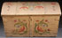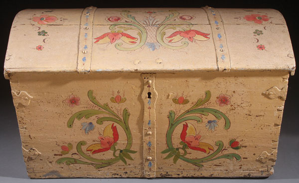 PER LYSNE (NORWEGIAN-AMERICAN 1880-1947), A NORWEGIAN TRAVEL TRUNK WITH ROSEMALING. The 19th century wood trunk with domed top and wrought iron strapwork later decorated by Per Lysne over the original cream painted ground with scrolled acanthus and floral blossoms, the cover opening to reveal a similar motif underneath, the trunk signed on back panel "Per A. Lysne Stoughton, Wis." Length 35.25 inches (89.5 cm), height 19.5 inches (49.5 cm), width 19.5 inches (49.5 cm).