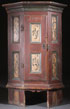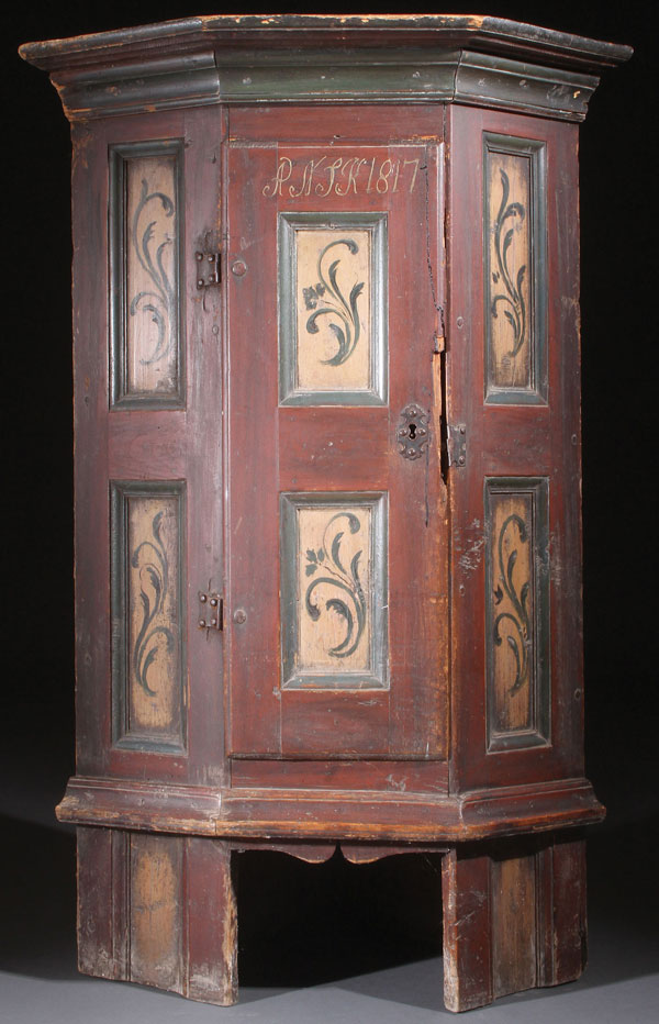 AN EARLY 19TH CENTURY NORWEGIAN CORNER CABINET WITH ROSEMALING. Inscribed 1817, the three sided front with central door, each having two recessed panels painted with stylized scrolled foliates on a cream ground within bluish green molded surrounds on a brick red frame. The door inscribed "A.N.S.K. 1817." Height 49.75 inches, width 33 inches, depth 22 inches (126.75 x 84 x 56 cm).